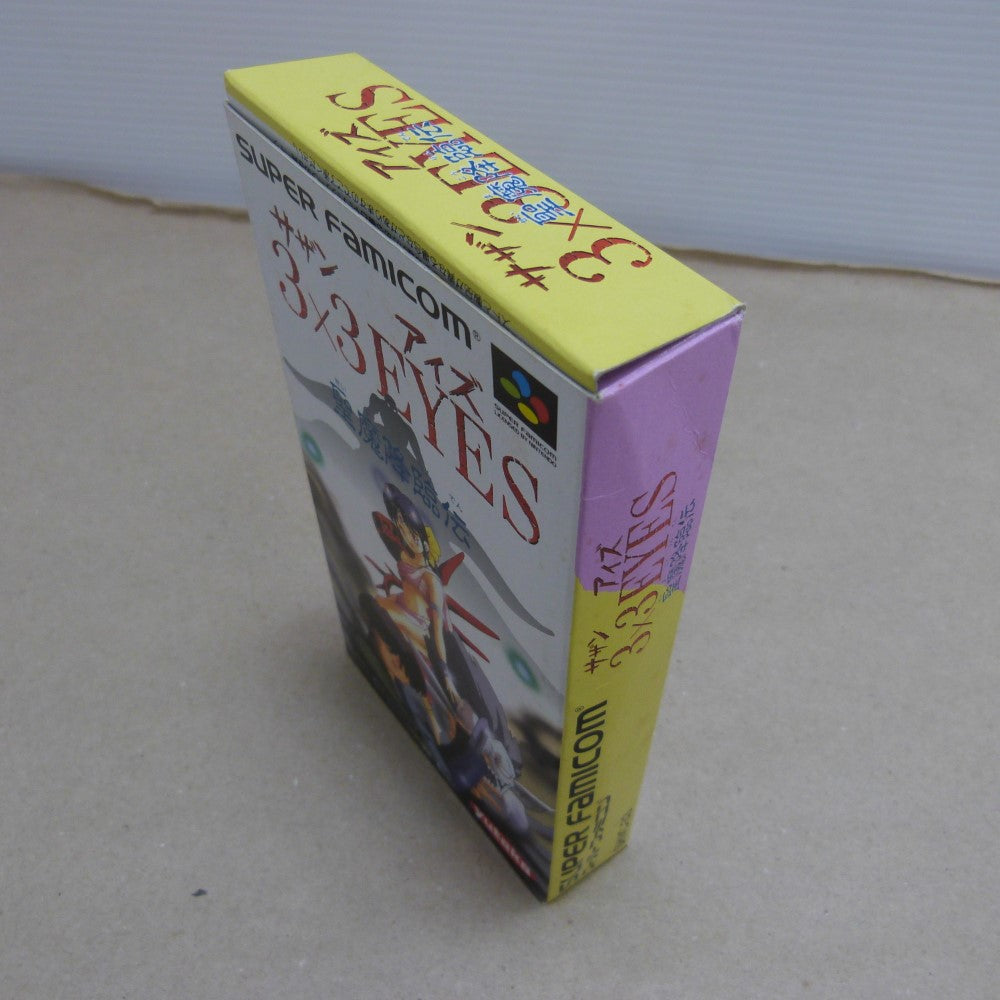 | 商品説明 | ユタカより1992年7月28日にスーパーファミコン用ソフトとして発売されたロールプレイングゲーム。マンガ『3x3 EYES』を題材とした作品。ゲームは、八雲、パイ、ゲスト的に加わる仲間の3人でゲームを進めていく。パーティの内八雲以外の2人が倒れると即ゲームオーバーとなる。終盤に仲間になるグプターはレベル上げが必須になるが、必要な経験値が非常に多い。また、飛行機代が異常に高くて金欠による詰みもある。 |